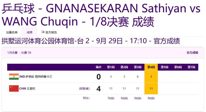 男单1/8决赛:王楚钦、樊振东分别4-0战胜对手晋级男单8强ZeroTsu_02 @懂球帝2023-09-29 18:109月29日,杭州亚运会乒乓球男单1/8决赛,中国选手樊振东、王楚钦分别4-0战胜对手晋级8强。亚运会男单1/8决赛,王楚钦4-0战胜纳纳塞卡兰晋级,4局比分分别是11-3、11-3、11-6、11-3;樊振东4-0战胜中国香港选手林兆恒,4局比分分别是11-4、11-3、11-6、11-3。展开更多