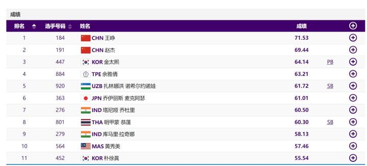 第104金!王峥、赵杰包揽亚运会女子链球冠亚军绿鱼绿 @懂球帝2023-09-29 20:58北京时间9月29日,在杭州亚运会田径女子链球决赛中,中国选手王峥以71.53米的成绩夺得金牌,中国代表团本届金牌数来到104枚!在这场比赛中,东京奥运会亚军、3枚世锦赛奖牌得主王峥在最后一投投出71米53,最终凭借这一成绩夺得冠军。另一名中国选手赵杰以69.44米的成绩获得银牌,铜牌被韩国选手金太熙夺得。展开更多