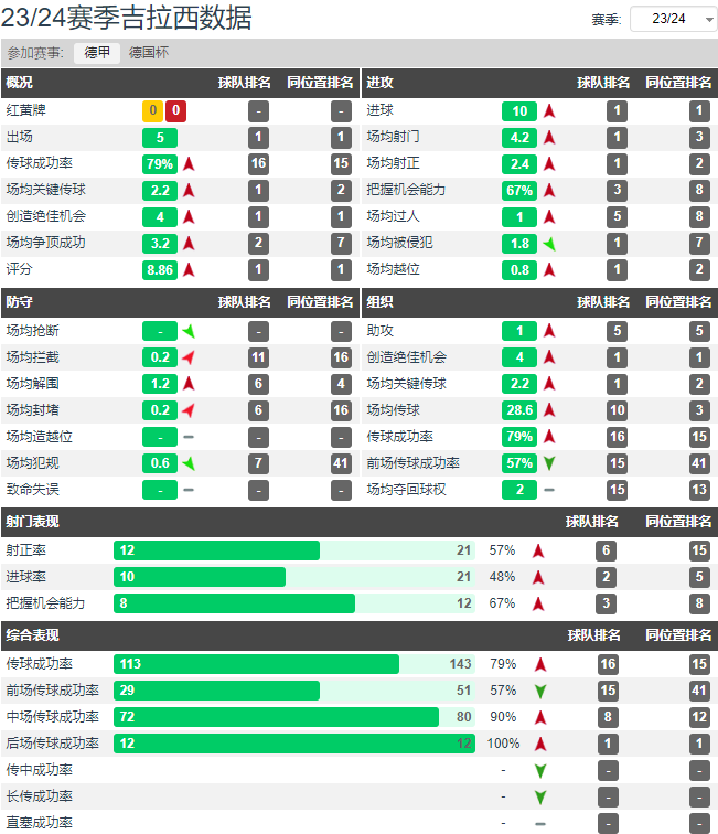或许谁也无法想到,吉拉西本赛季仅用5场434分钟便取得了10粒进球,他场均4.2次射门,2.4次射正,这在五大联赛史上任何俱乐部都是前所未有的壮举。