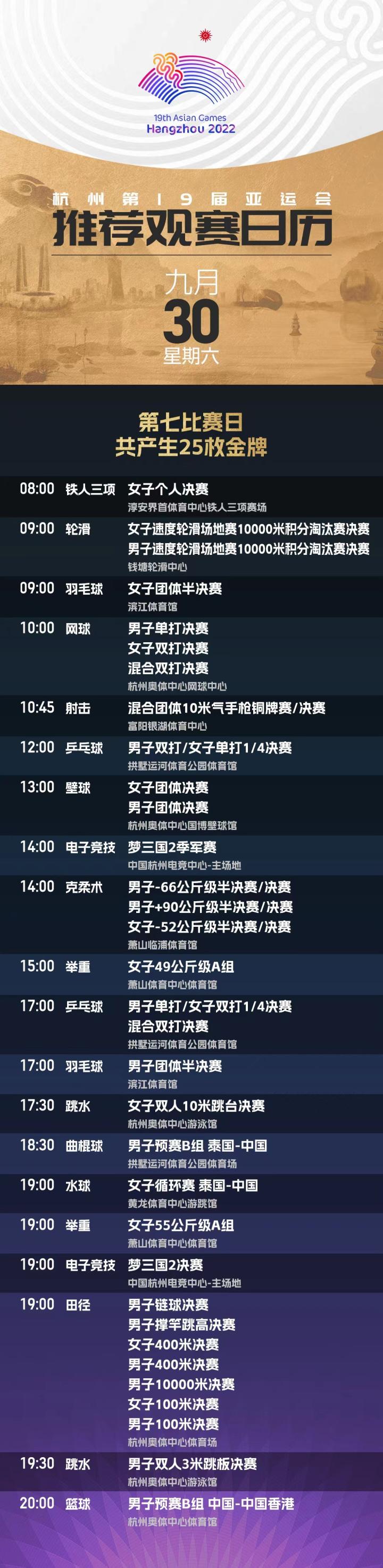 北京时间9月30日,杭州亚运会迎来第7个比赛日,共产生25枚金牌。其中中国队两个夺金大项跳水和举重均将拉开帷幕,田径项目则将进行男子和女子100米飞人大战。