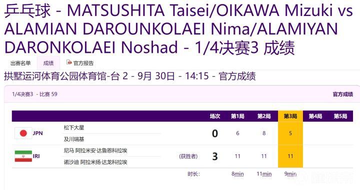 在之前男团1/4决赛中,伊朗队以3个3-2、总比分3-0力克日本晋级4强。
