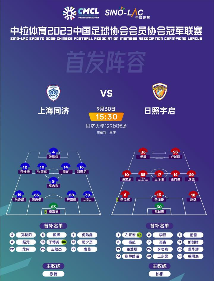 上海同济方面,主帅徐磊安排守门员李海涛担任场上队长,朱峥嵘、张萌祺、高志杰、陈志楠等球员首发出战。戈伟、孙铭阳、赵元等球员现身替补席。