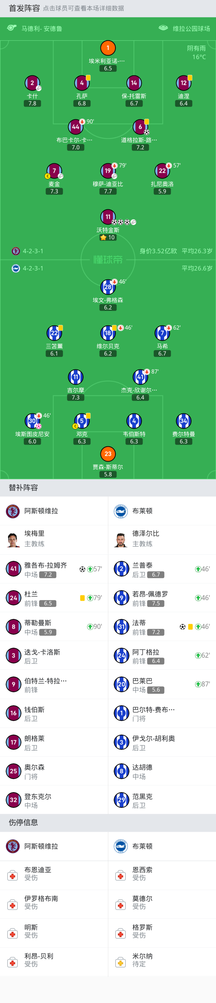 阿斯顿维拉首发:1-埃米利亚诺-马丁内斯, 12-迪涅, 7-麦金, 11-沃特金斯, 14-保-托雷斯, 44-布巴卡尔-卡马拉, 4-孔萨, 2-卡什, 6-道格拉斯-路易斯, 22-扎尼奥洛, 19-穆萨-迪亚比