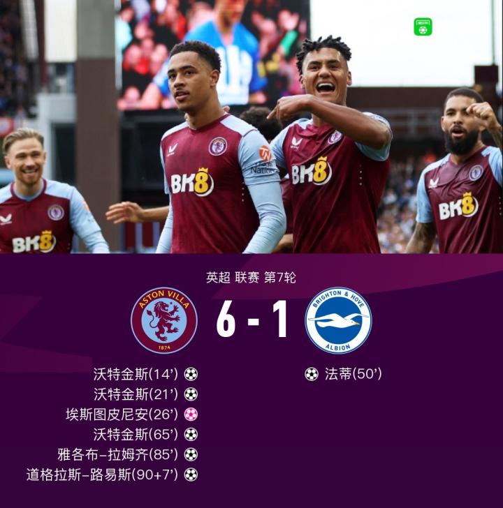 北京时间9月30日英超 联赛 第7轮,阿斯顿维拉主场对阵布莱顿。阿斯顿维拉沃特金斯帽子戏法,雅各布-拉姆齐破门,道格拉斯-路易斯破门。布莱顿法蒂破门,埃斯图皮尼安自摆乌龙。最终比分6-1。