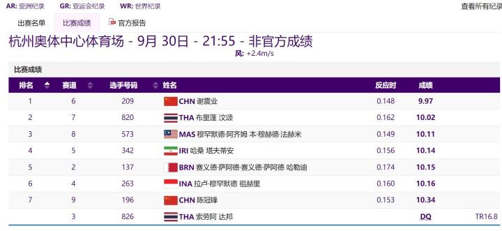 决赛中,第6道出发的谢震业在后程展现出强大的加速能力,最终以9秒97率先冲线,成为新的亚洲飞人!这一成绩也追平了谢震业个人最好成绩。另一位中国选手陈冠锋获得第7名。