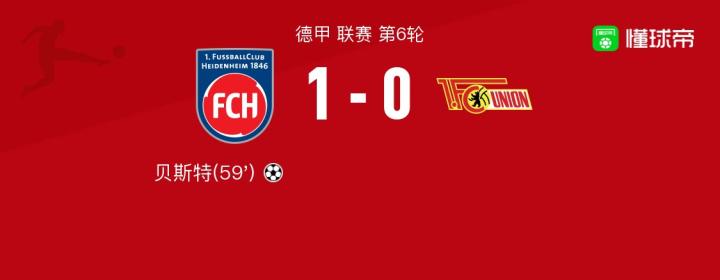 北京时间9月30日德甲联赛第6轮,海登海姆主场对阵柏林联合。上半场比赛双方均无建树;下半场,贝斯特任意球制胜。最终,柏林联合0-1,苦吞四连败。
