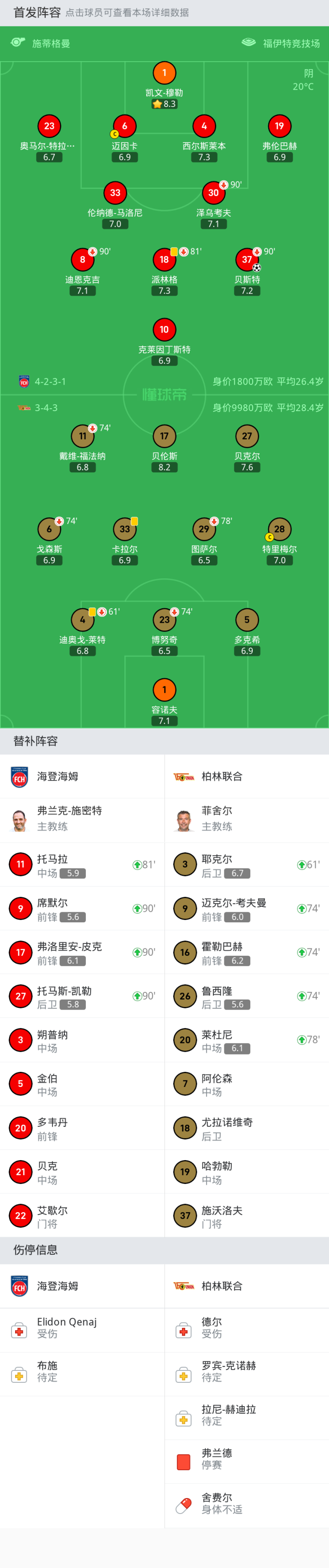 海登海姆1-0送柏林联合四连败,贝斯特任意球直挂死角制胜