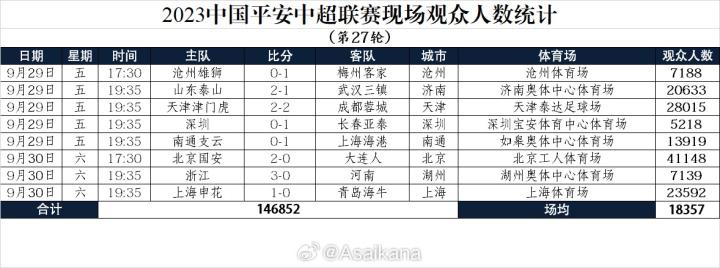 中超第27轮现场观众:国安vs大连41148人最多,三场未过万ETChalmers @懂球帝2023-09-30 23:53中超第27轮战罢,本轮现场观众人数统计出炉,工体41148人最多,三场比赛未过万。中超第27轮现场观众人数沧州雄狮vs梅州客家 7188人山东泰山vs武汉三镇 20633人天津津门虎vs成都蓉城 28015人深圳vs长春亚泰 5218人南通支云vs上海海港 13919人北京国安vs大连人 41148人浙江vs河南 7139人上海申花vs青岛海牛 23592人数据来源:@Asaikana 展开更多