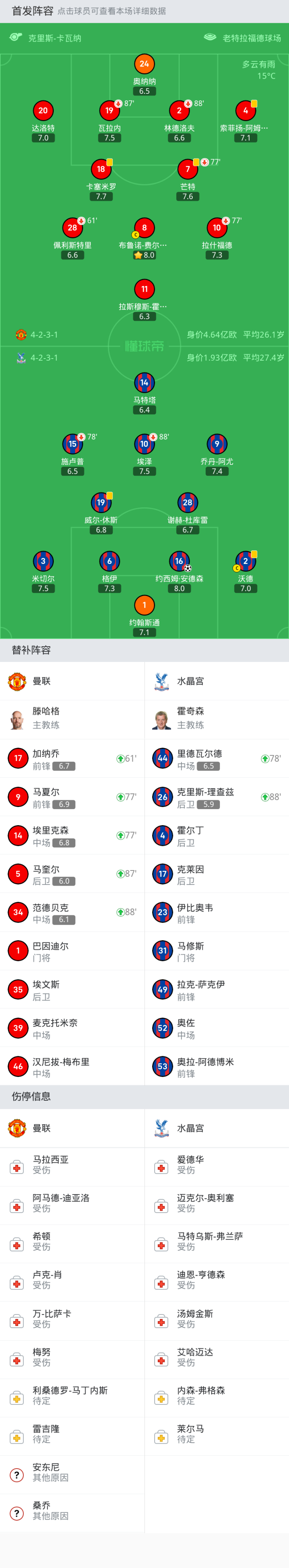 水晶宫首发:2-沃德, 9-乔丹-阿尤, 15-施卢普, 1-约翰斯通, 19-威尔-休斯, 16-约西姆·安德森, 14-马特塔, 10-埃泽, 6-格伊, 28-谢赫-杜库雷, 3-米切尔