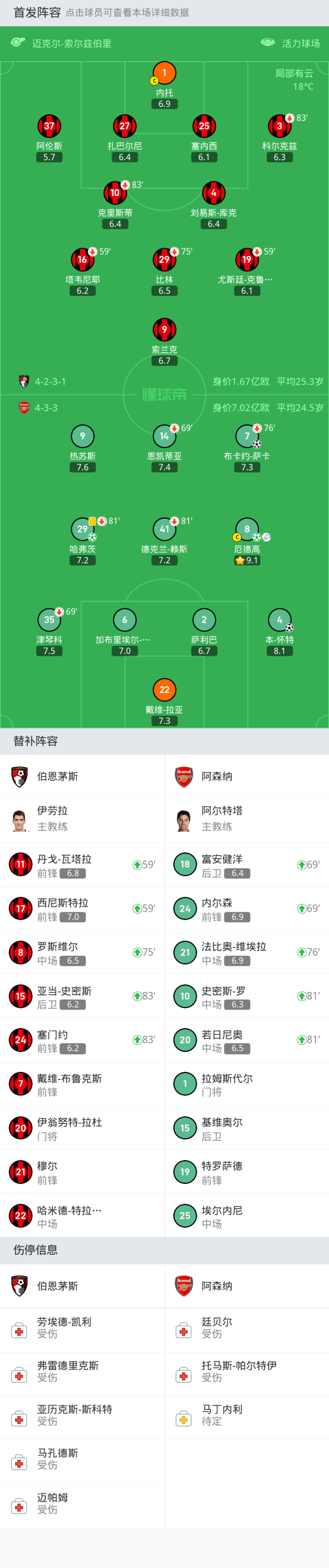 伯恩茅斯首发:1-内托, 10-克里斯蒂, 9-索兰克, 4-刘易斯-库克, 29-比林, 16-塔韦尼耶, 19-尤斯廷-克鲁伊维特, 25-塞内西, 37-阿伦斯, 27-扎巴尔尼, 3-科尔克兹