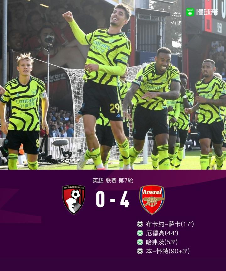 北京时间9月30日22:00英超联赛第7轮,伯恩茅斯主场对阵阿森纳。上半场萨卡头球补射破门,恩凯蒂亚造点,厄德高点射破门;下半场厄德高造点,哈弗茨点射破门斩获阿森纳生涯首球,萨卡受伤被换下,本-怀特最后阶段头球建功扩大比分。最终阿森纳客场4-0战胜伯恩茅斯。