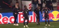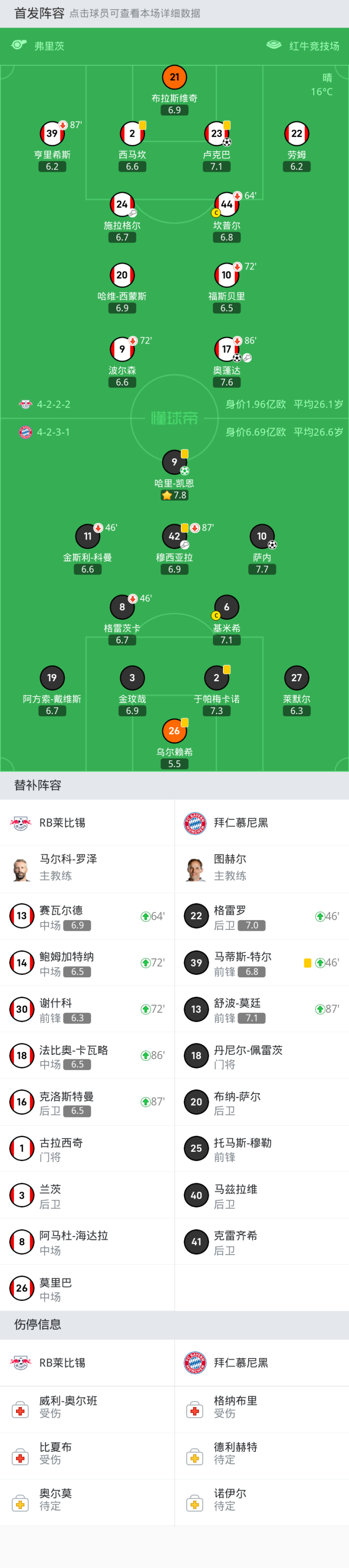 RB莱比锡首发:10-福斯贝里, 21-布拉斯维奇, 44-坎普尔, 9-波尔森, 39-亨里希斯, 24-施拉格尔, 22-劳姆, 17-奥蓬达, 2-西马坎, 23-卢克巴, 20-哈维-西蒙斯