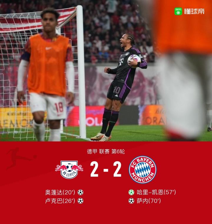 北京时间10月01日德甲 联赛 第6轮,RB莱比锡主场对阵拜仁慕尼黑。上半场奥蓬达单刀破门,卢卡巴抽射建功,下半场凯恩点射破门,萨内单刀破门。最终两队2-2战平。