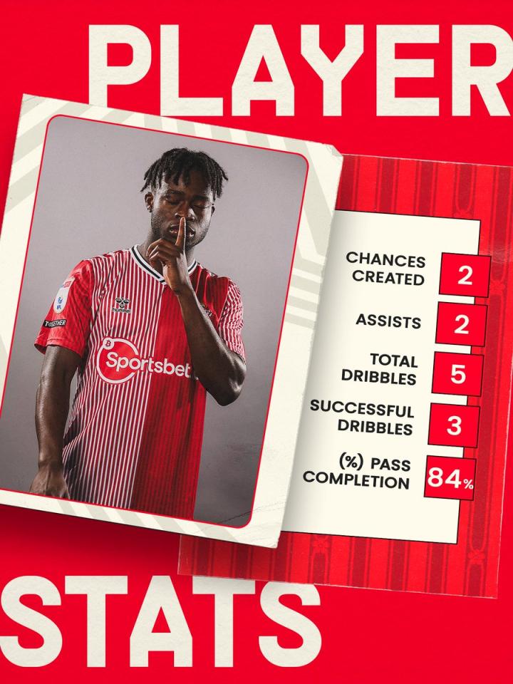 本场比赛,苏莱曼纳表现出色,南安普顿官方列出了本场比赛苏莱曼纳的一些关键数据: