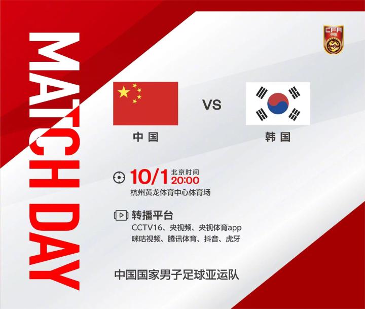 北京时间10月1日20:00,在杭州亚运会男足1/4决赛一场焦点对决中,中国队将坐镇杭州黄龙体育中心体育场,迎战老对手韩国队。
