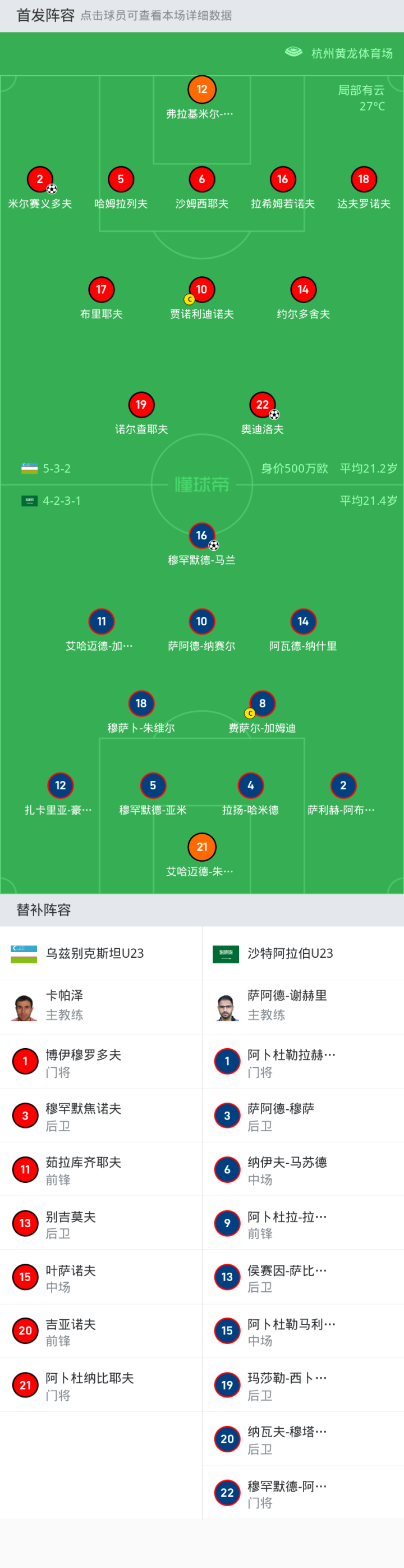 乌兹别克斯坦U23首发:10-贾诺利迪诺夫, 14-约尔多舍夫, 6-沙姆西耶夫, 2-米尔赛义多夫, 19-诺尔查耶夫, 18-达夫罗诺夫, 17-布里耶夫, 12-弗拉基米尔-纳扎罗夫, 22-奥迪洛夫, 5-哈姆拉列夫, 16-拉希姆若诺夫