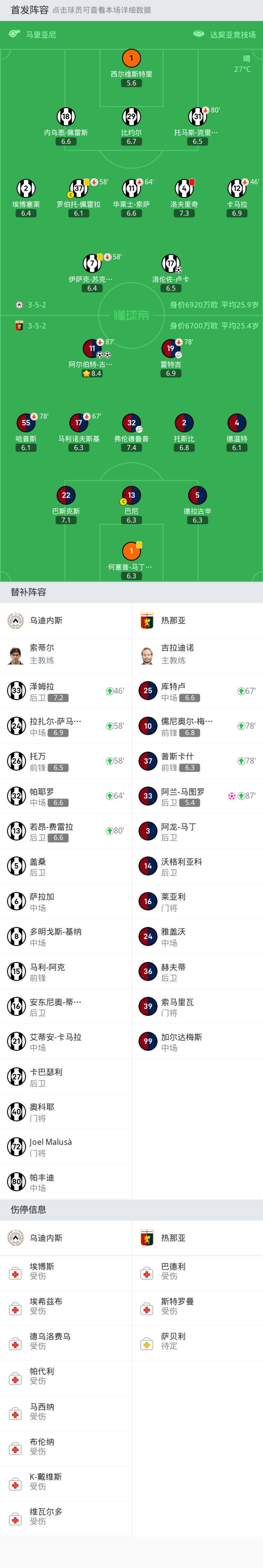 热那亚首发:17-马利诺夫斯基, 13-巴尼, 11-阿尔伯特-古德蒙德松, 55-哈普斯, 2-托斯比, 1-何塞普-马丁内斯, 22-巴斯克斯, 19-雷特吉, 32-弗伦德鲁普, 4-德温特, 5-德拉古辛