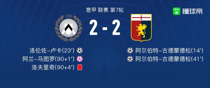 北京时间10月01日意甲 联赛 第7轮,乌迪内斯主场对阵热那亚。乌迪内斯洛伦佐-卢卡破门。热那亚阿尔伯特-古德蒙德松梅开二度,阿兰-马图罗自摆乌龙。。最终比分2-2。