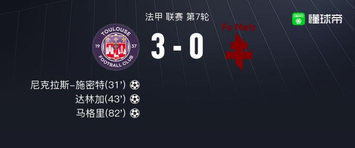 北京时间10月01日法甲 联赛 第7轮,图卢兹主场对阵梅斯。图卢兹尼克拉斯-施密特破门,达林加破门,马格里破门。最终比分3-0。