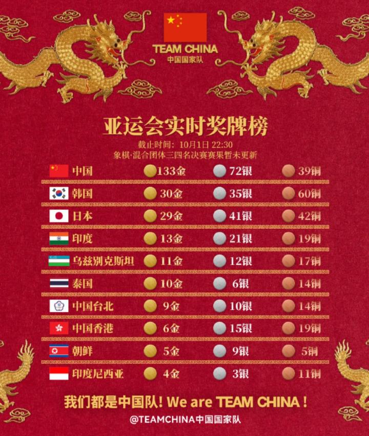 北京时间10月1日,杭州亚运会结束第8个比赛日。中国代表团今日获得19金4银5铜,以133金72银39铜继续在奖牌榜上遥遥领跑。其中林雨薇夺得女子100米栏冠军,吴艳妮因抢跑被取消成绩;国羽男团完成让二追三逆转摘金;国足亚运队0-2不敌韩国无缘四强。