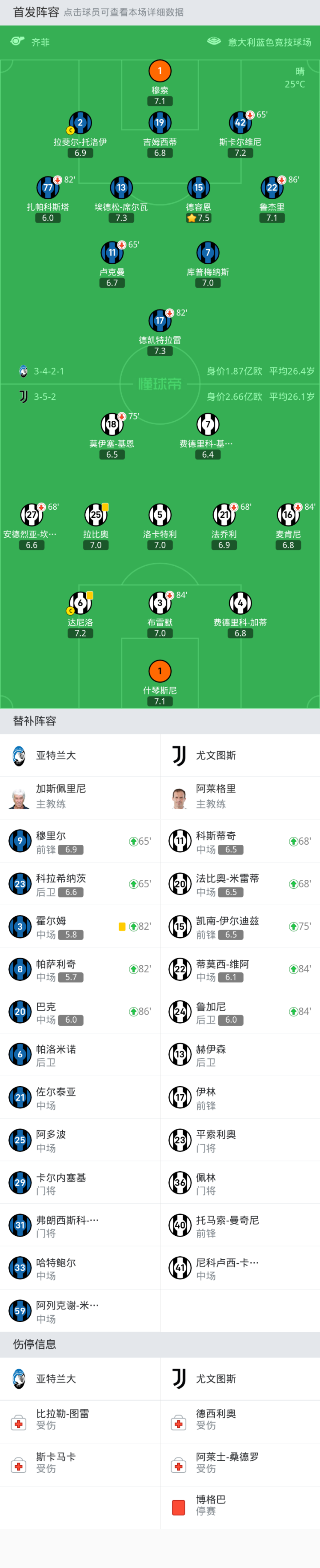 亚特兰大首发:2-拉斐尔-托洛伊, 15-德容恩, 19-吉姆西蒂, 77-扎帕科斯塔, 1-穆索, 7-库普梅纳斯, 11-卢克曼, 13-埃德松-席尔瓦, 17-德凯特拉雷, 22-鲁杰里, 42-斯卡尔维尼