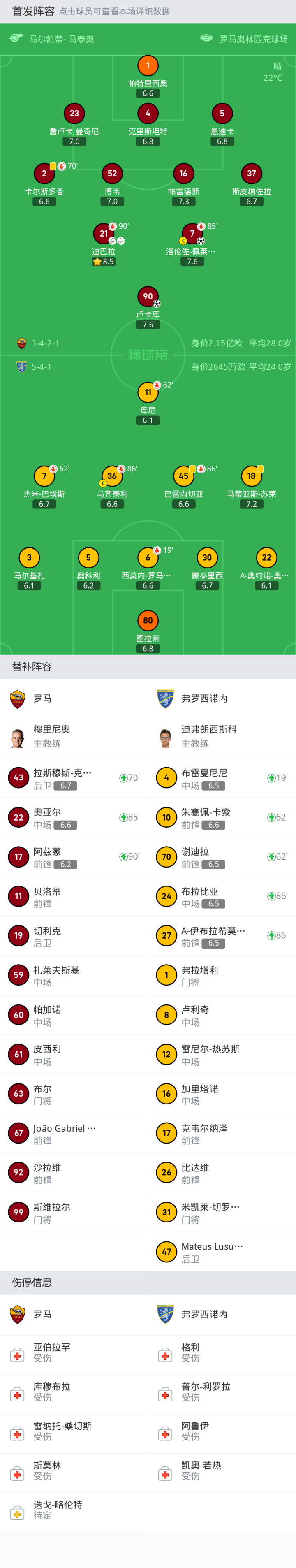 弗罗西诺内首发:6-西莫内-罗马尼奥利, 7-杰米-巴埃斯, 36-马齐泰利, 3-马尔基扎, 80-图拉蒂, 11-库尼, 5-奥科利, 22-A-奥约诺-奥姆瓦-托克, 45-巴雷内切亚, 30-蒙泰里西, 18-马蒂亚斯-苏莱