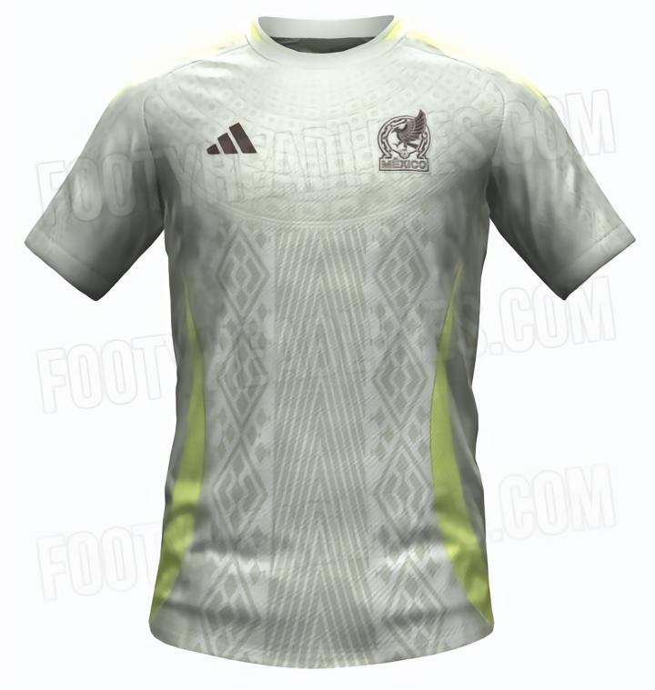 近日知名球衣网站Fotty Headlines曝光了墨西哥2024客场球衣的预测照,该球衣采用浅灰色为主题并且搭上了荧光绿的条纹。