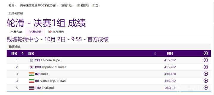 赛后官方成绩显示,中国台北队的完赛成绩比韩国队快了0.01秒。
