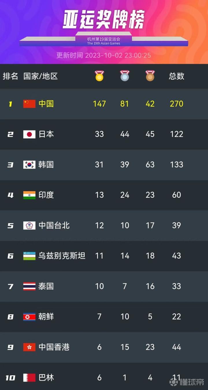 北京时间10月2日,杭州亚运会结束第9个比赛日。中国代表团今日获得14金9银3铜,目前以147金81银42铜共计270枚奖牌稳坐奖牌榜榜首。其中王楚钦在乒乓球男单决赛中鏖战7局力克樊振东,本届亚运独揽4金;中国队在电竞DOTA2决赛中2-1逆转蒙古,夺得金牌。