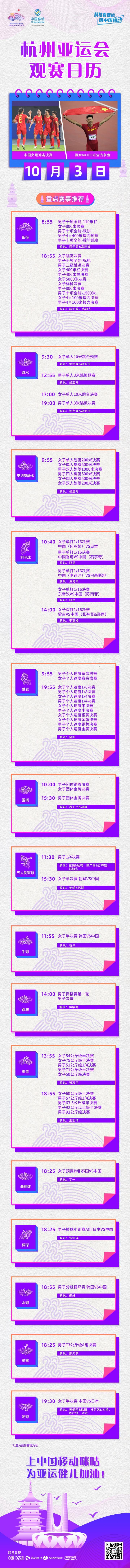 北京时间10月3日,杭州亚运会迎来第10个比赛日,共将产生36枚金牌。其中田径比赛将产生10金,男子和女子4×100米接力将是今晚重头戏;足球赛场,中国女足也将和日本展开激烈对决,争夺一个决赛席位。