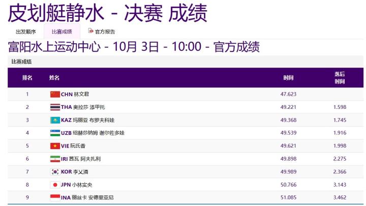 第148金!亚运会女子200米单人划艇决赛:林文君夺金ZeroTsu_02 @懂球帝2023-10-03 10:12北京时间10月3日,第19届杭州亚运会皮划艇静水项目,女子200米单人划艇决赛,中国选手林文君夺金,这也是中国代表团的第148枚金牌。亚运会女子200米单人划艇决赛,中国选手林文君以47.623的成绩夺得冠军,亚军是泰国选手,季军是哈萨克斯坦选手。展开更多