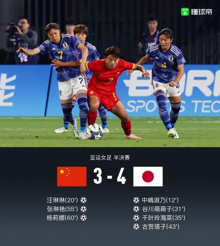 中国女足3-4日本女足无缘亚运决赛,张琳艳、杨莉娜连追两球
