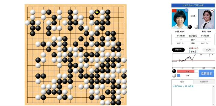 本场比赛李赫五段完胜韩国女子“第一人”崔精九段,为夺金打下坚实的基础,中国队1-0领先韩国队。於之莹七段与吴侑珍九段则战的难解难分,形势几经逆转,最终於之莹遗憾落败,韩国队1-1追平中国队。最后一局是天才少女的对决,吴依铭五段在开局不利的情况下抓住开劫战机,战胜金恩持七段。总比分2-1为中国队拿下最终的胜利。