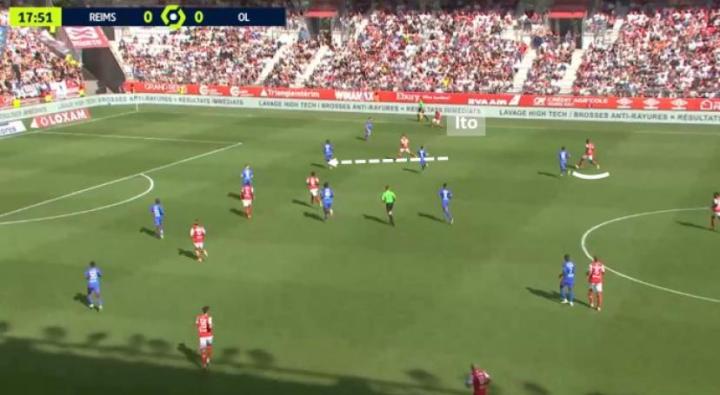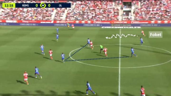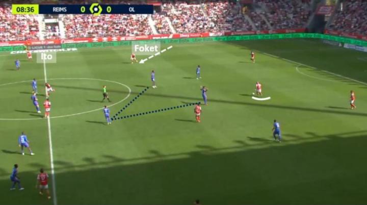 当伊东纯野对位塔利亚菲科时,边后卫福克特在内线接球,里昂的三中场正在压迫兰斯的中路出球,但福克特绕到了后面,托利索的位置太靠前了。兰斯很容易找到福克特推进到里昂后场,注意这时中场球员穆内西已经压到了锋线位置。