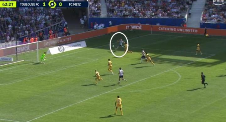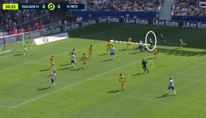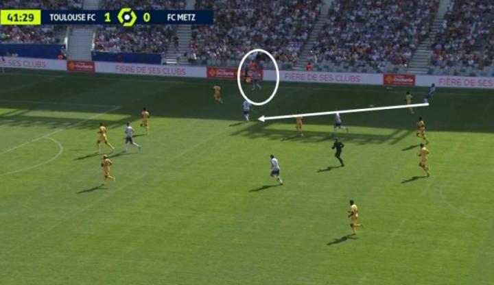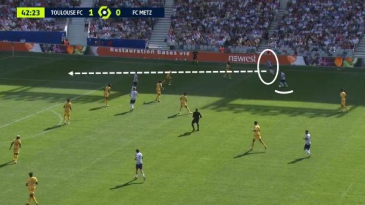 就在第1个进球前,梅斯禁区有6名图卢兹球员参与进攻,边后卫德斯勒就是其中之一。他在小范围的冲刺给多努姆创造了空间,尽管传中没有直接找到队友,但图卢兹通过控制第二落点,在30秒后得分。