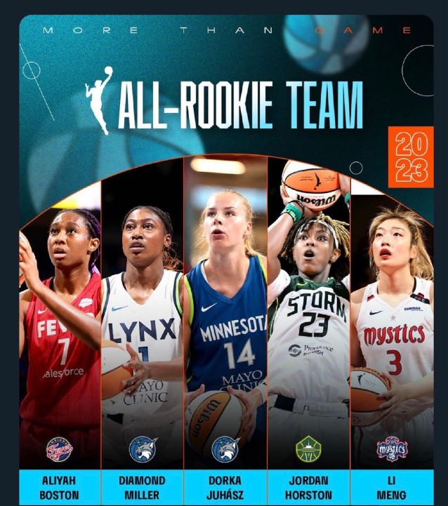 本赛季WNBA最佳新秀阵容为:李梦(神秘人)、阿丽亚-波士顿(狂热)、多尔卡-尤霍斯(山猫)、乔丹-霍斯顿(风暴)、戴蒙德-米勒(山猫)。