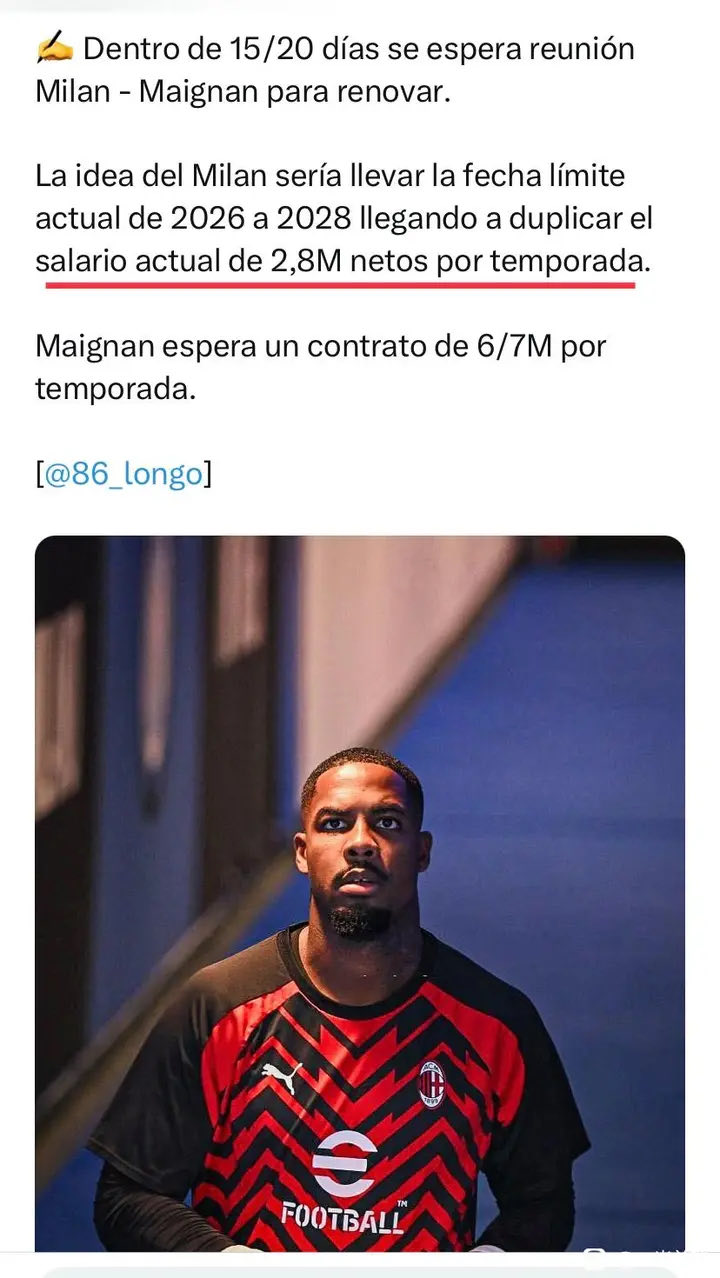 隆戈:米兰希望以5.6M薪水与迈尼昂续约至202...圣西罗卡卡_ @懂球帝2023-10-03 14:39隆戈:米兰希望以5.6M薪水与迈尼昂续约至2028年,球员想要6/7M 米兰与迈尼昂的续约会议预计将在 15/20 天内进行。米兰的想法是把目前的期限从2026年延长到2028年,将目前每季净薪280万的工资翻倍。迈尼昂想要6-7M薪水。展开更多