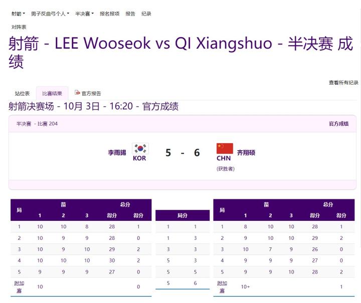 附加赛双方各射一支箭,最终齐翔硕在附加赛胜出,惊险晋级决赛。