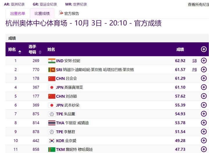 亚运会女子标枪决赛:吕会会摘铜,奥运冠军刘诗颖名列第五凡尔赛小木屋 @懂球帝2023-10-03 21:5010月3日,杭州亚运会田径项目女子标枪决赛,中国选手吕会会摘得铜牌。决赛当中,印度选手拉妮以62米92的成绩夺得金牌,斯里兰卡选手莱坎格摘得银牌。吕会会成绩为61米29摘得铜牌,奥运冠军刘诗颖名列第五。展开更多