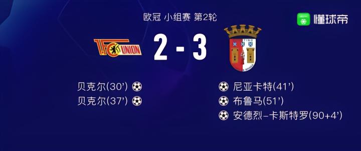 北京时间10月04日欧冠 小组赛 第2轮,柏林联合主场对阵布拉加。柏林联合贝克尔梅开二度。布拉加尼亚卡特破门,布鲁马破门,安德烈-卡斯特罗破门。最终比分2-3。