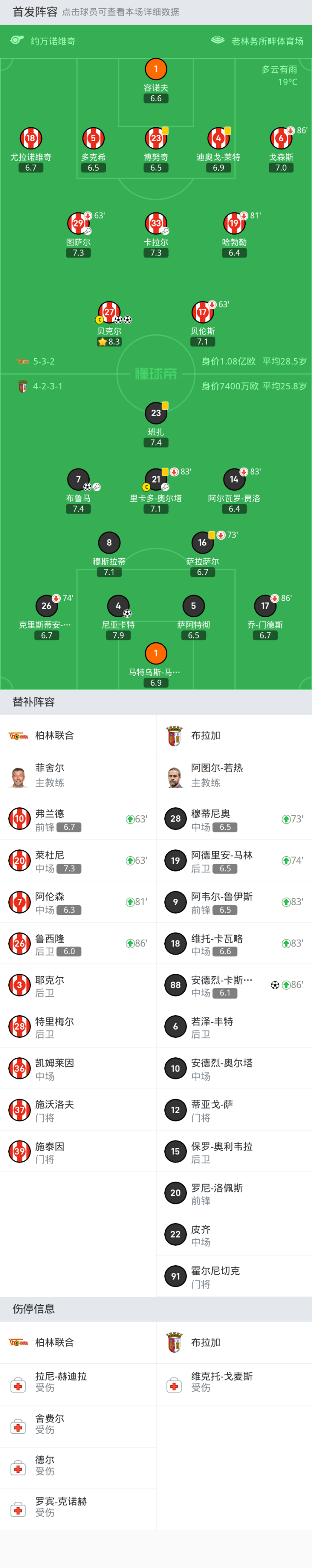 柏林联合首发:23-博努奇, 1-容诺夫, 17-贝伦斯, 27-贝克尔, 19-哈勃勒, 6-戈森斯, 29-图萨尔, 18-尤拉诺维奇, 5-多克希, 33-卡拉尔, 4-迪奥戈-莱特