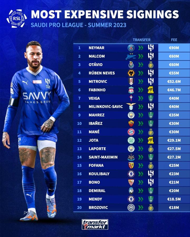 今年夏天以来,沙特成了足坛的流量担当,跟随C罗脚步前来淘金的名字一个比一个响亮。根据德国转会市场网,今夏沙特职业联赛(SPL)转会支出高达9.57亿欧元,净支出8.92亿,两项数据均仅次于英超,“断层”领先于其他联赛。