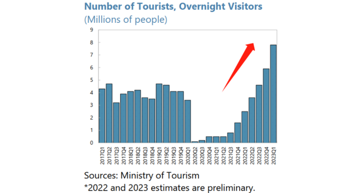 随着疫情影响的消散,坐拥伊斯兰教三大圣地中的两个(麦加和麦地那),旅游业也将重新崛起。度过2020和2021两年的低谷后,访问沙特的过夜游客数量在2022年急速爬坡,在四季度超越了疫情前的单季度水平,并在2023年持续着高增长态势。