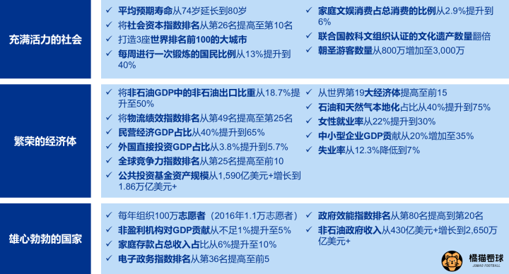 “充满活力的社会”包括伊斯兰文化认同和输出,对内加强民族文化研究,打造文化高地,对外做好朝圣者服务;建设文娱产业,提升居民的幸福感和生活品质,重点打造体育强国。