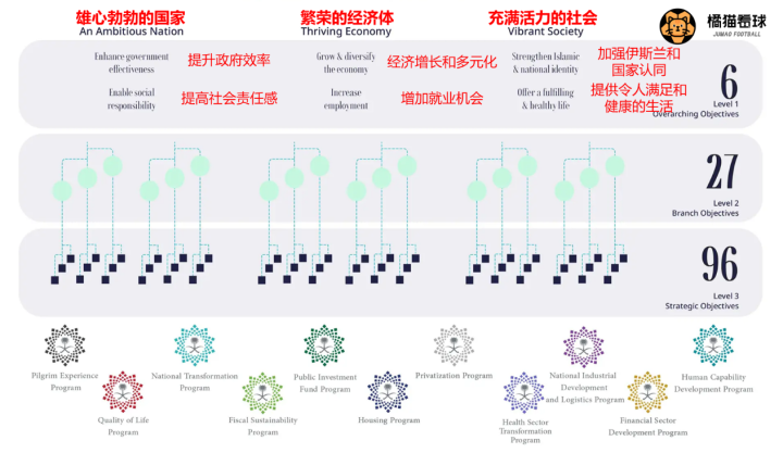 MBS在寄语中表示,希望打造“阿拉伯和穆斯林世界的心脏、全球投资的主导力量和连接亚欧非三大洲的全球枢纽”。为实现领导人的宏伟目标,愿景计划制定了“充满活力的社会、繁荣的经济体和雄心勃勃的国家”三个主题,下设6个主要目标、27个子目标和96个战略目标。