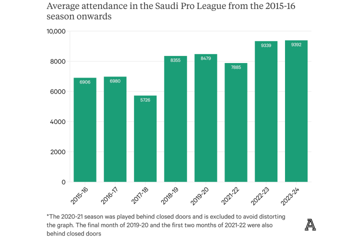 我们无从知晓MBS的数字是如何得出的,从财务角度看,沙特在足球、高尔夫、F1、电竞、自行车、WWE等项目上的疯狂投入,似乎很难获得与之匹配的直接回报——新赛季SPL场均上座人数仍未破万,还没有体现出对本国居民和外来旅客的显著影响。