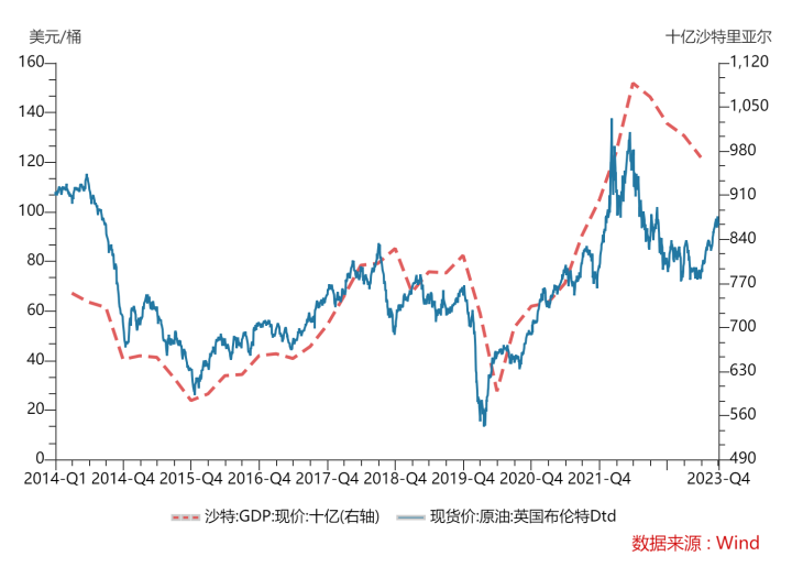 得益于油价的坚挺,2022年沙特GDP增速高达8.7%,名列G20之首,其中石油经济GDP增速为15.3%,非石油经济的GDP增长只有4.8%。事实上过去十年沙特GDP的走势与油价基本一致,在碳中和的背景下,降低石油依赖的急迫性更上一档。
