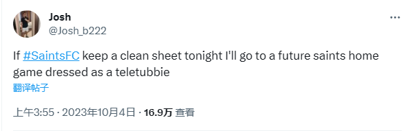 这位名叫Josh的南安普顿球迷在社交媒体上发文称:“如果南安普顿这场比赛保持零封,我会打扮成天线宝宝,未来在主场去现场观看南安普顿的比赛。”