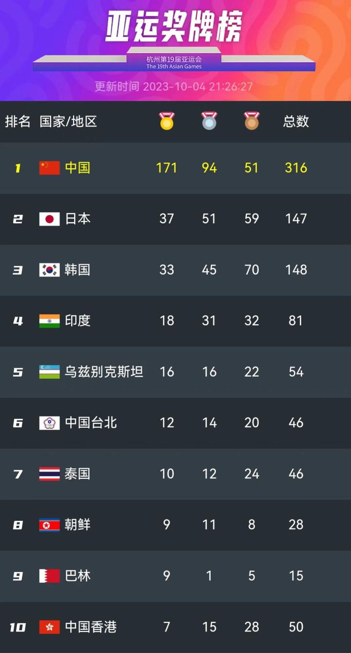北京时间10月4日,杭州亚运会第11个比赛日结束,共产生33枚金牌。中国代表团今日获得10金4银5铜,目前累计以171金94银51铜稳坐奖牌榜榜首。中国男篮在半决赛遭菲律宾20分大逆转,无缘决赛;苏炳添、切阳什姐等7人正式递补获得奥运奖牌。