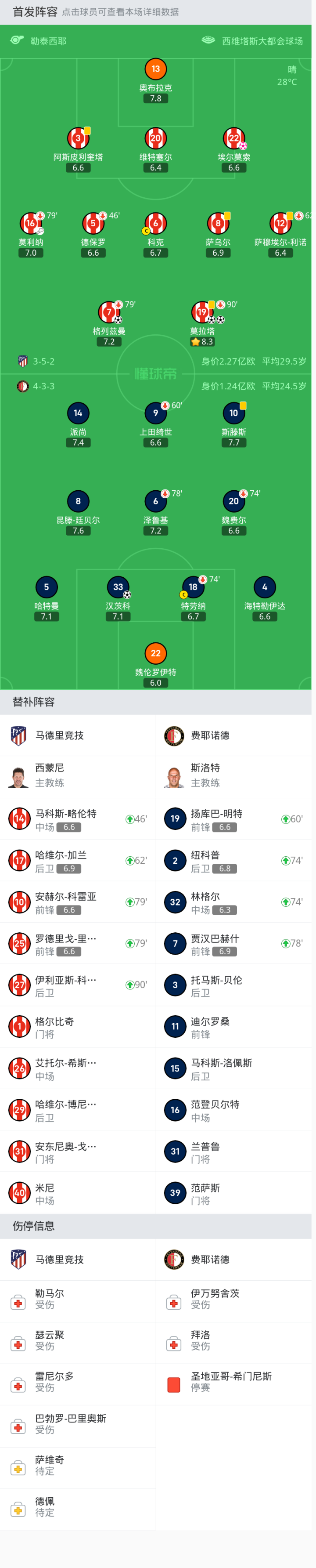 马德里竞技首发:20-维特塞尔, 3-阿斯皮利奎塔, 13-奥布拉克, 7-格列兹曼, 19-莫拉塔, 8-萨乌尔, 6-科克, 5-德保罗, 22-埃尔莫索, 16-莫利纳, 12-萨穆埃尔-利诺